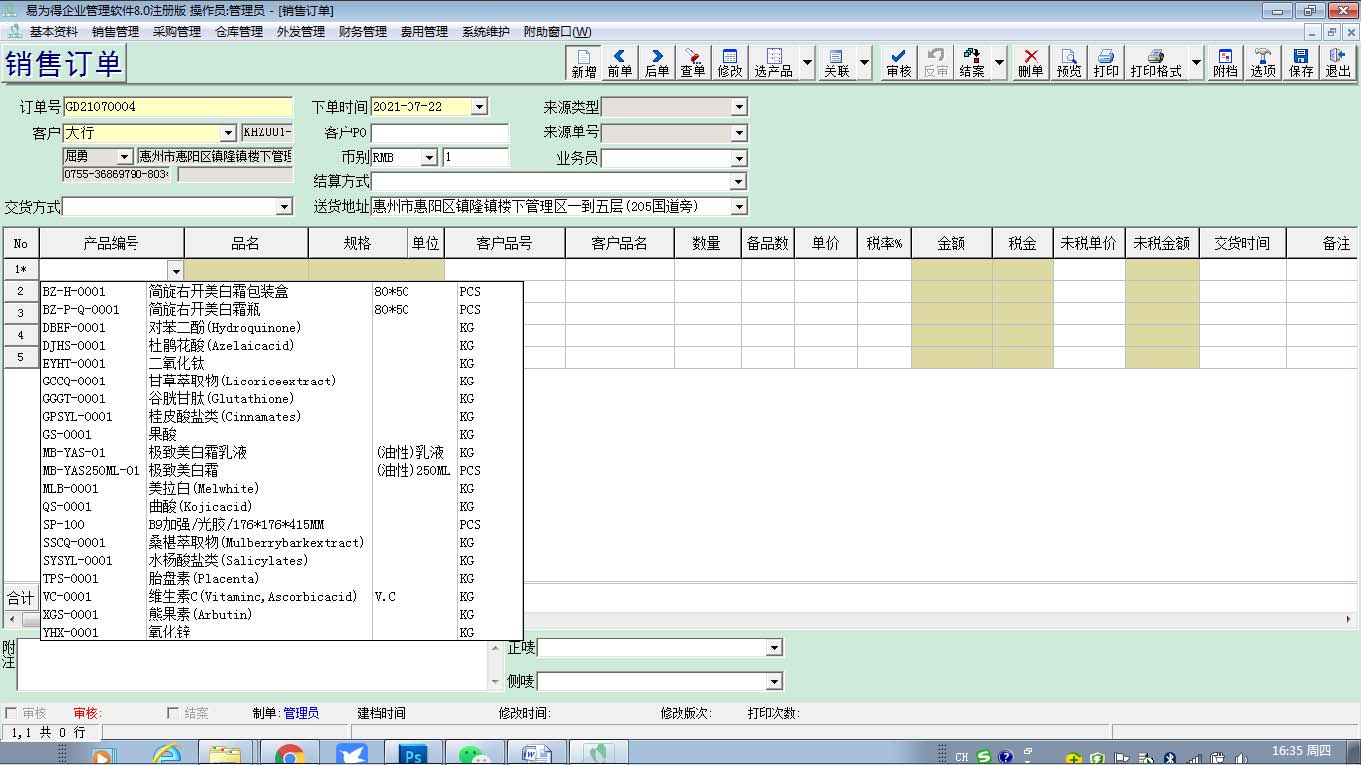 1、选择客户,输入客户订单的相关数据,例如‘客户PO’、‘币别’、我司业务员、产品编号、数量、单价、交货时间…等各种信息,点击“保存”按钮即可,点“审核”;销售订单就录入完成