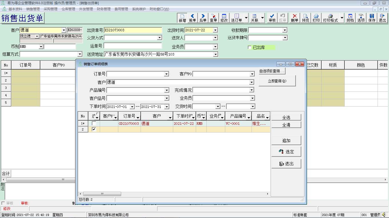 模块包含了:报价单、销售订单(是客户的采购订单转录)、销售出货、销售退货、销售回单以及各种详细报表;单据的录入、修改、删除、审核相关操作